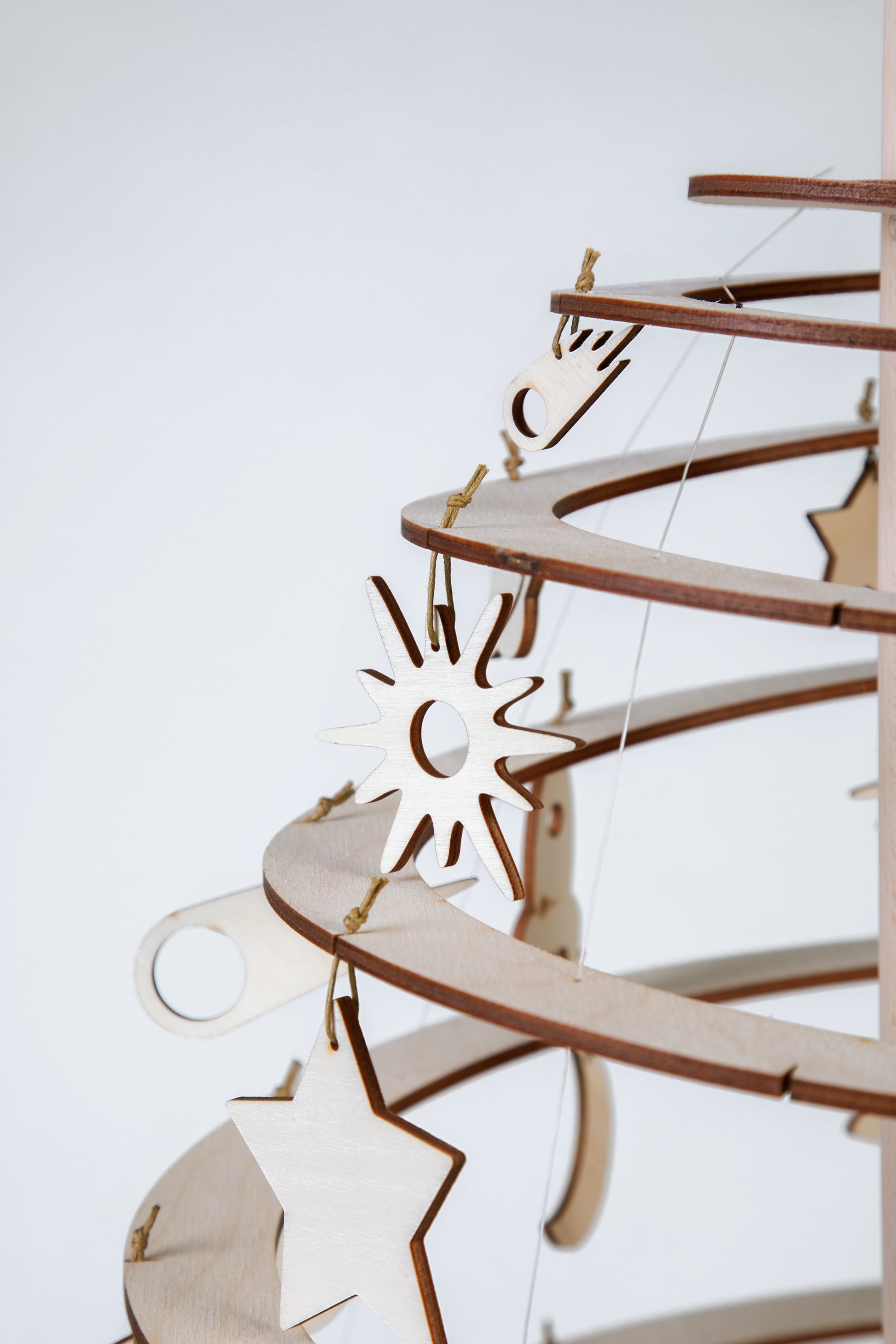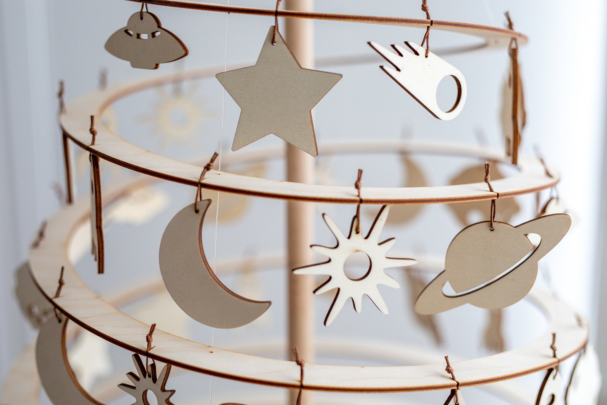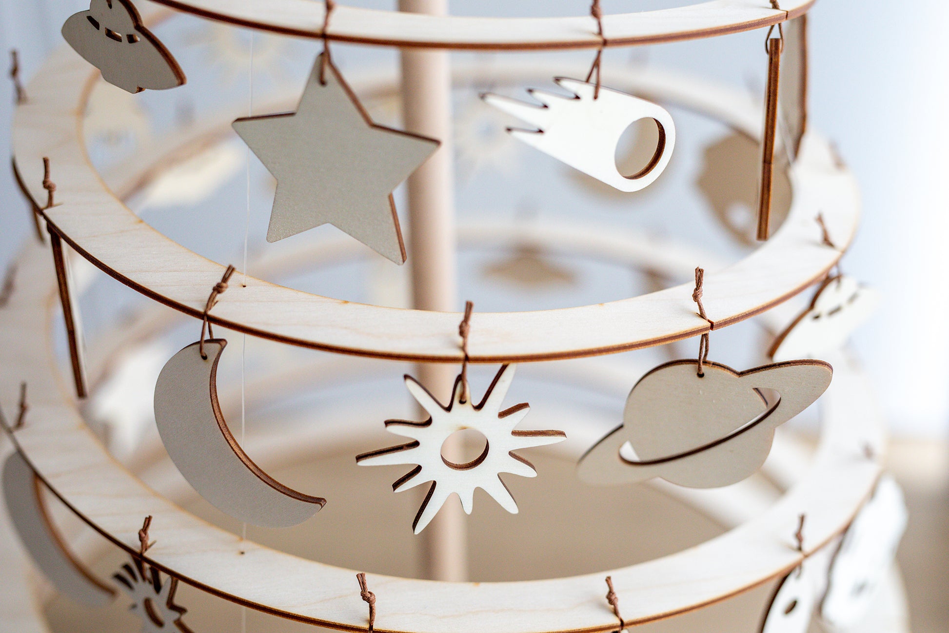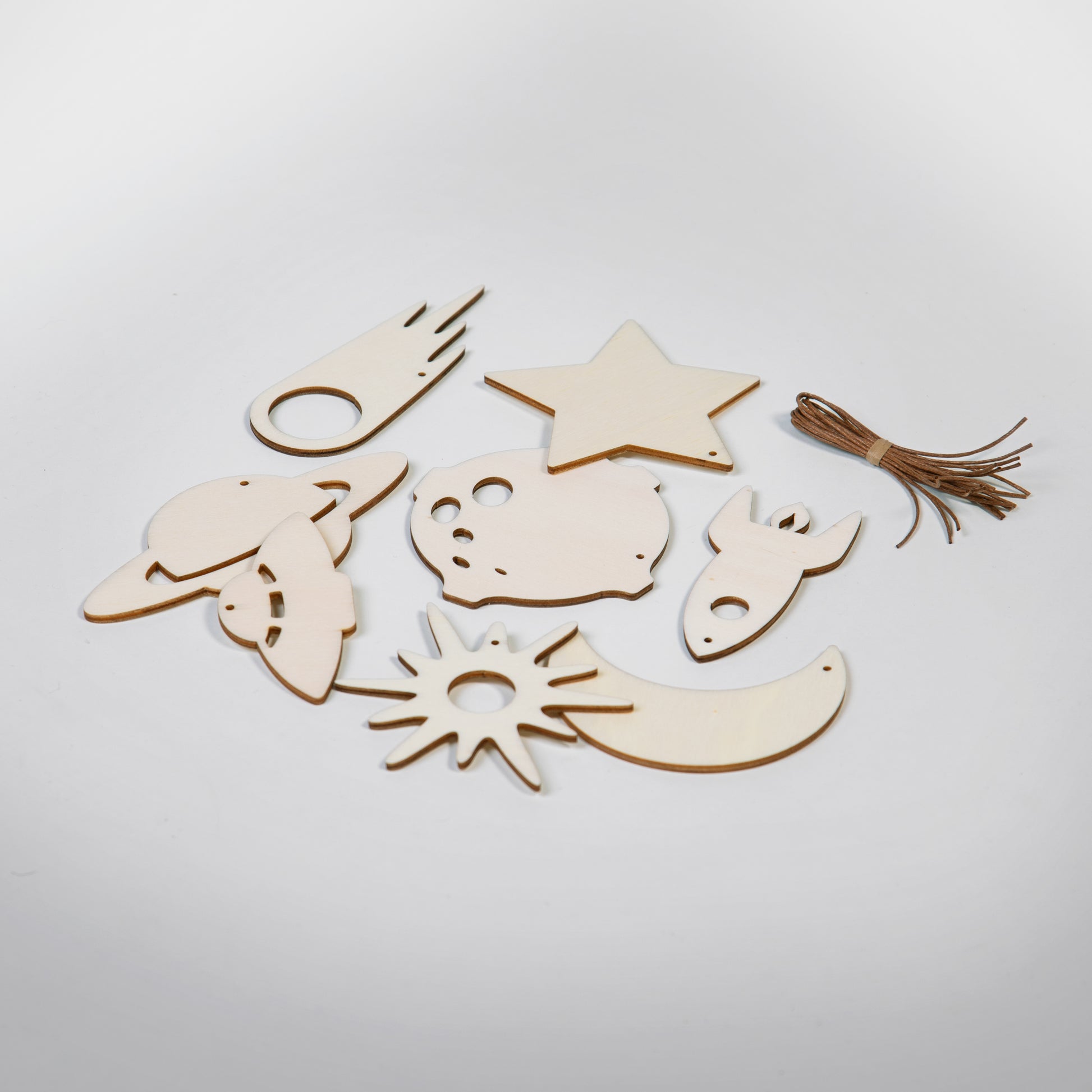 Een set houten ornamenten met verschillende vormen met een ruimtethema is een uitstekende keuze voor moderne en klassieke interieurs. Het tijdloze design en de warmte van het hout zorgen voor de perfecte kerstdecoratie in ieder huis.