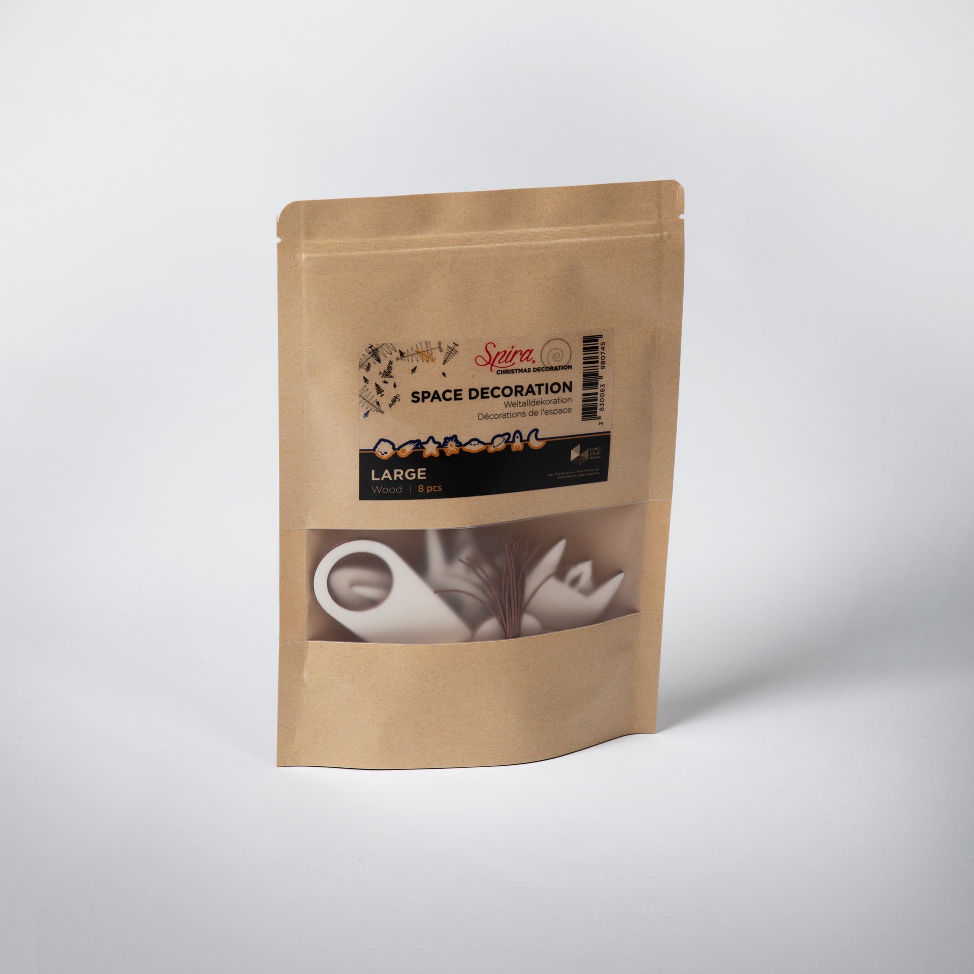 De set bevat 8 vilten ornamenten in ruimtemotieven. De ornamenten zijn verkrijgbaar in drie verschillende maten. De set bevat ook touwtjes om de decoraties op te hangen.