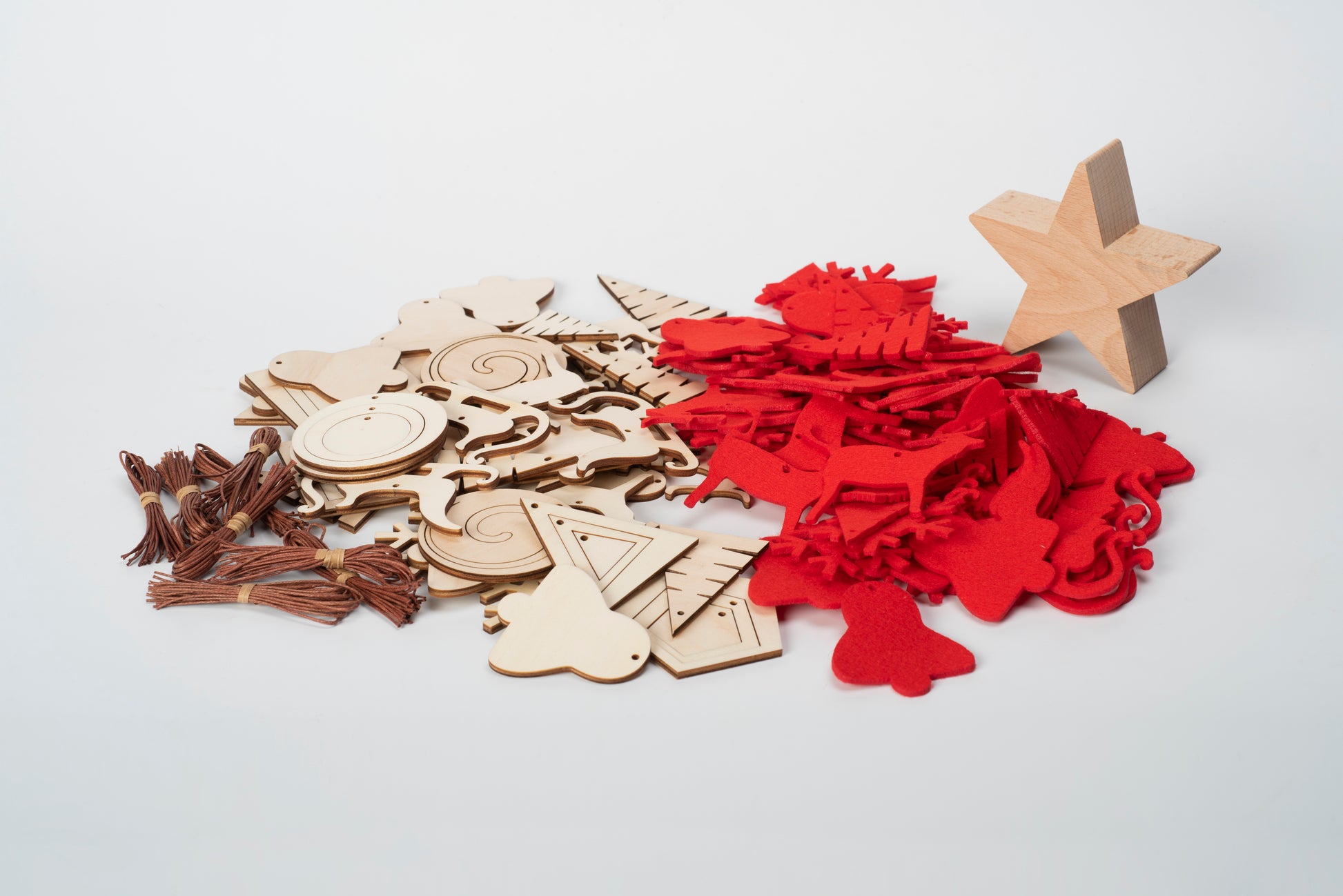 De set bevat een houten sterrentopper en een passend aantal ornamenten gemaakt van rood vilt en hout. Ophangkoorden zijn inbegrepen.